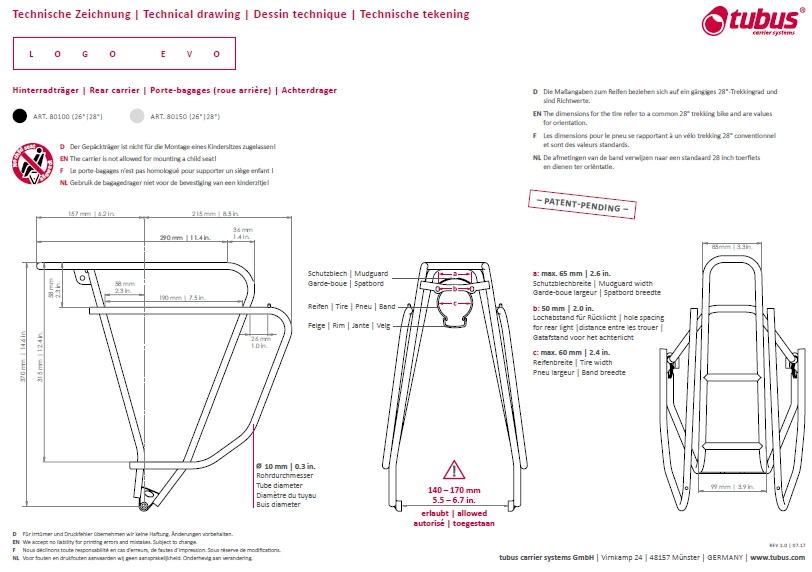 La norme ISO 11243:2016 précise que les porte-bagages avec une capacité de chargement de 27 kg et plus permettent automatiquement d’installer un siège enfant. Tubus jugeant dangereux le transport d’enfant sur porte-bagages, la marque limite volontairement la capacité de charge de ses porte-bagages à 26 kg. Cette restriction s’explique uniquement par des raisons légales, vis-à-vis de la norme mentionnée plus haut.