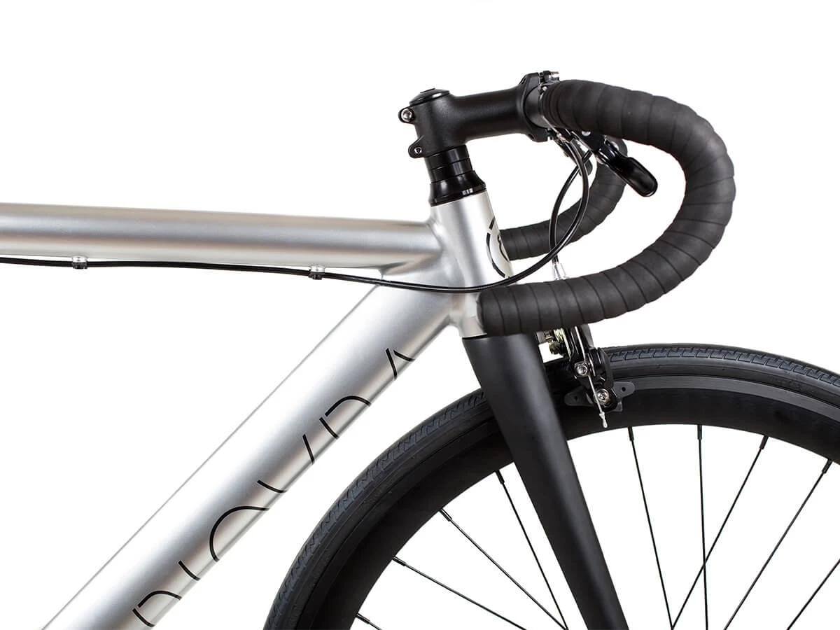Fabriqué en alliage 6061, avec un tube descendant 35,6 en forme de larme et un tube de selle hydroformé, il s’agit d’un cadre rigide et ultra-rapide. Le BLB La Piovra ATK Fixie & Single Speed (argent poli) est jumelé avec un tube de direction conique et une fourche conique entièrement en carbone. Le vélo tient la route avec brio.