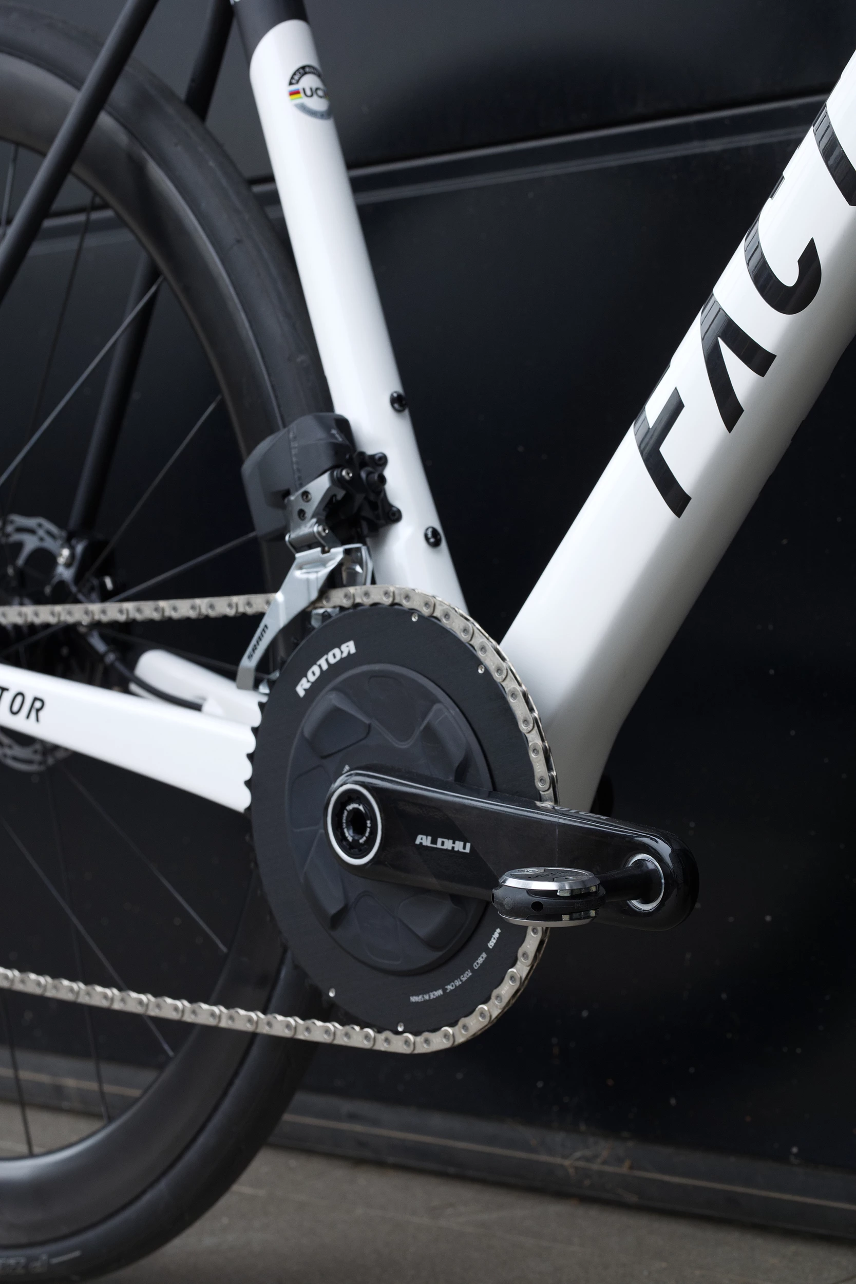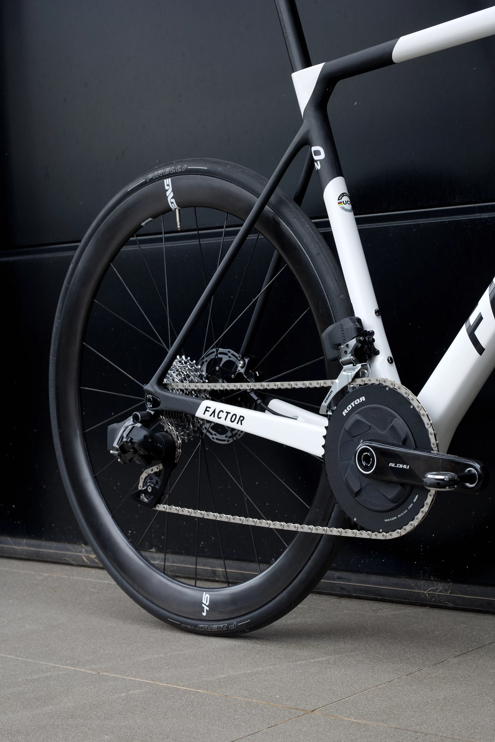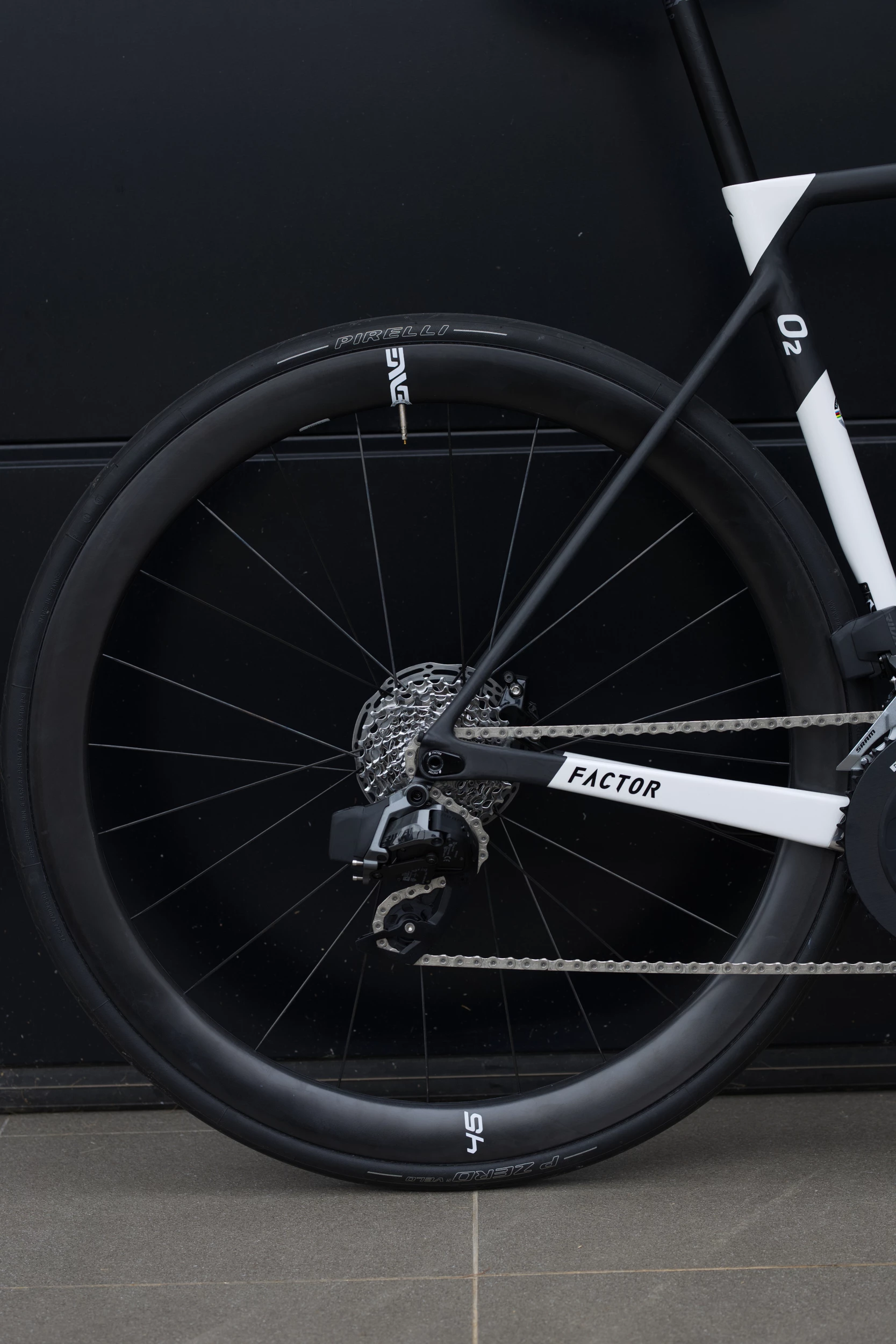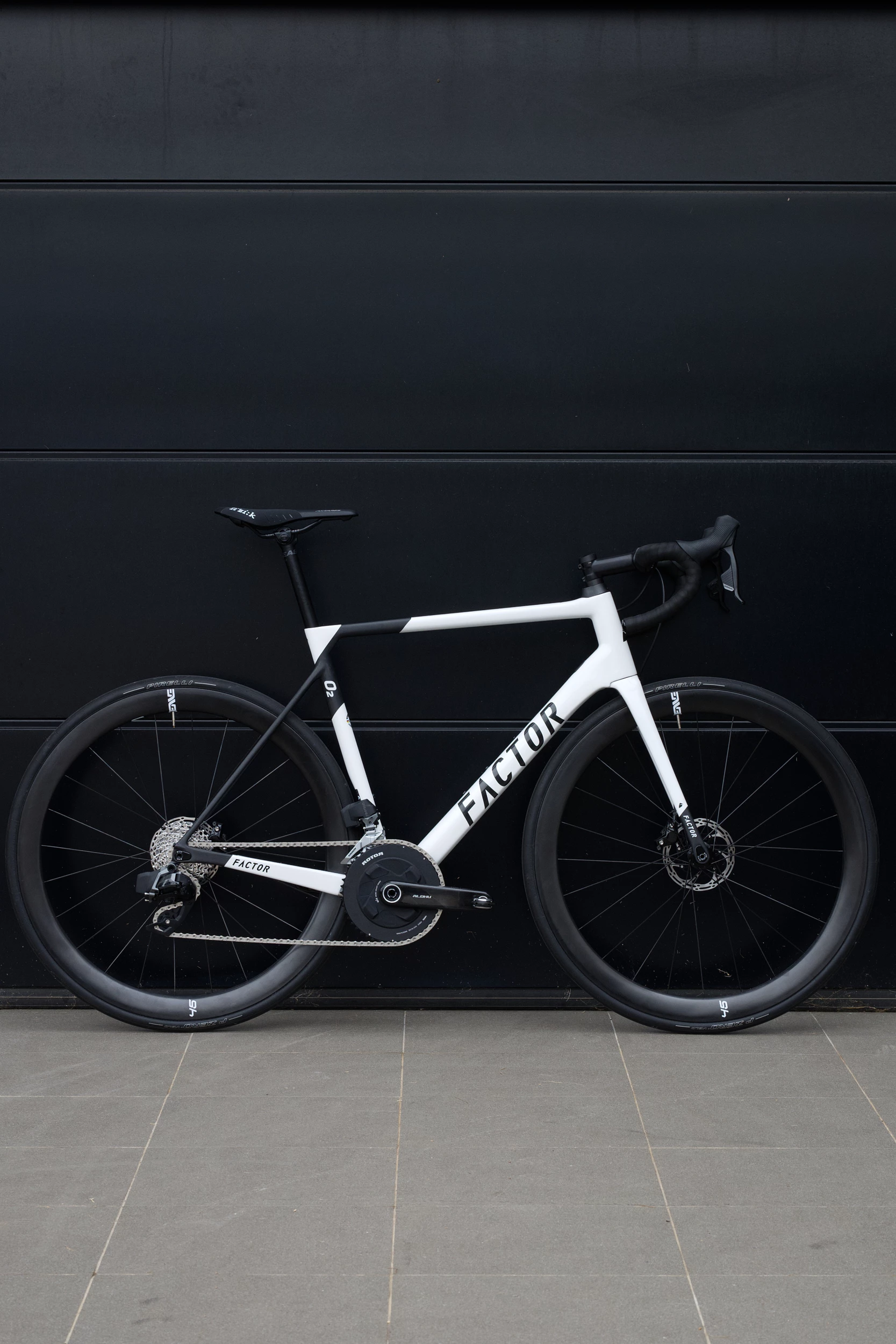 La version V2 du Factor O2 en montage maison ADV, Roue Enve Foundation, pédalier carbone Rotor, groupe Rival AXS et cintre carbone Easton.