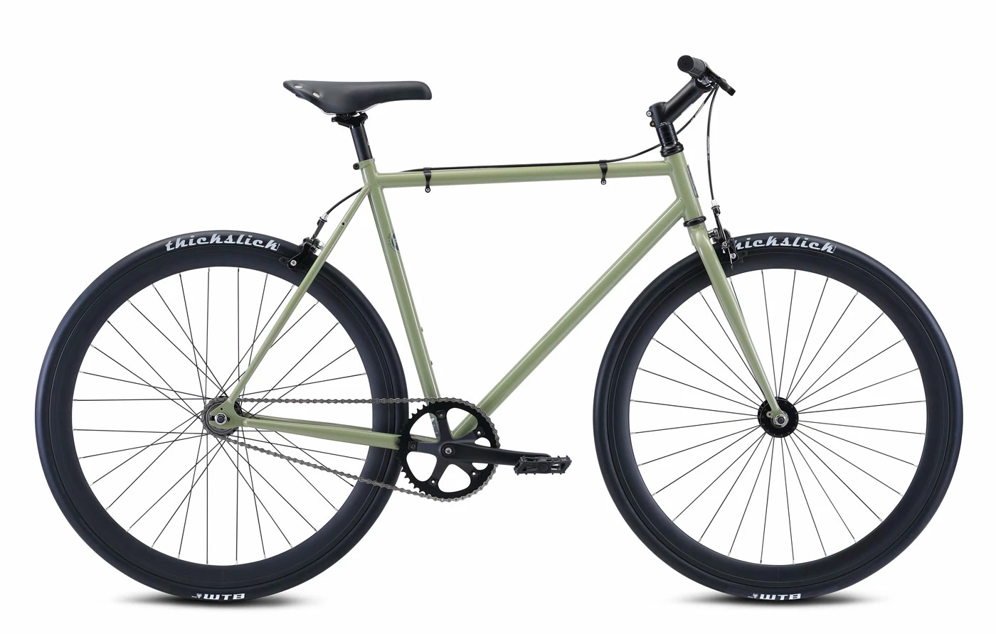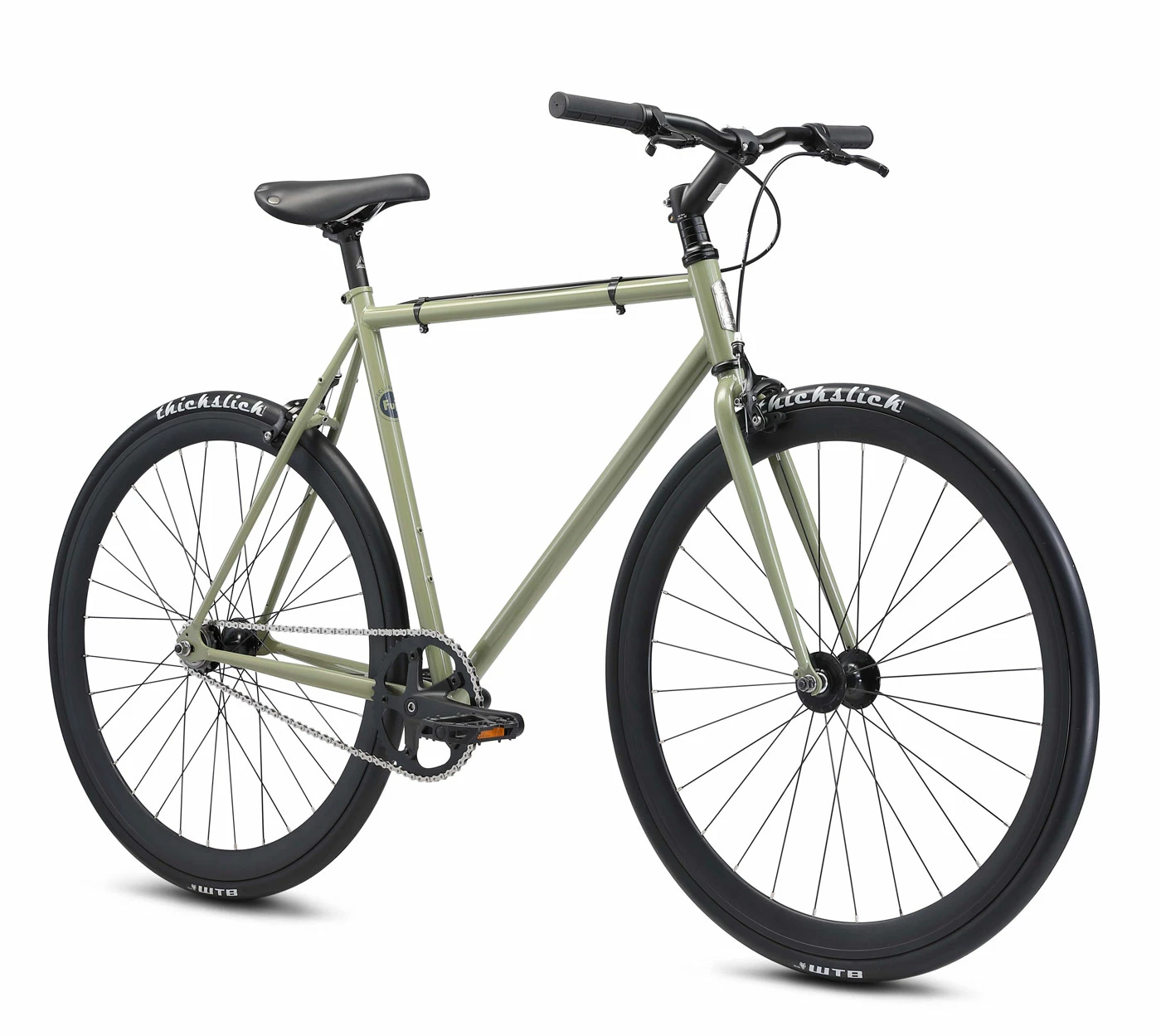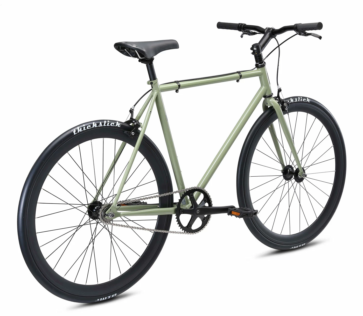 Un single speed bien adapté à la ville avec: une position relevé, des pneus Thickslick en 28C, attache rack/garde boue, fixie et roue libre.